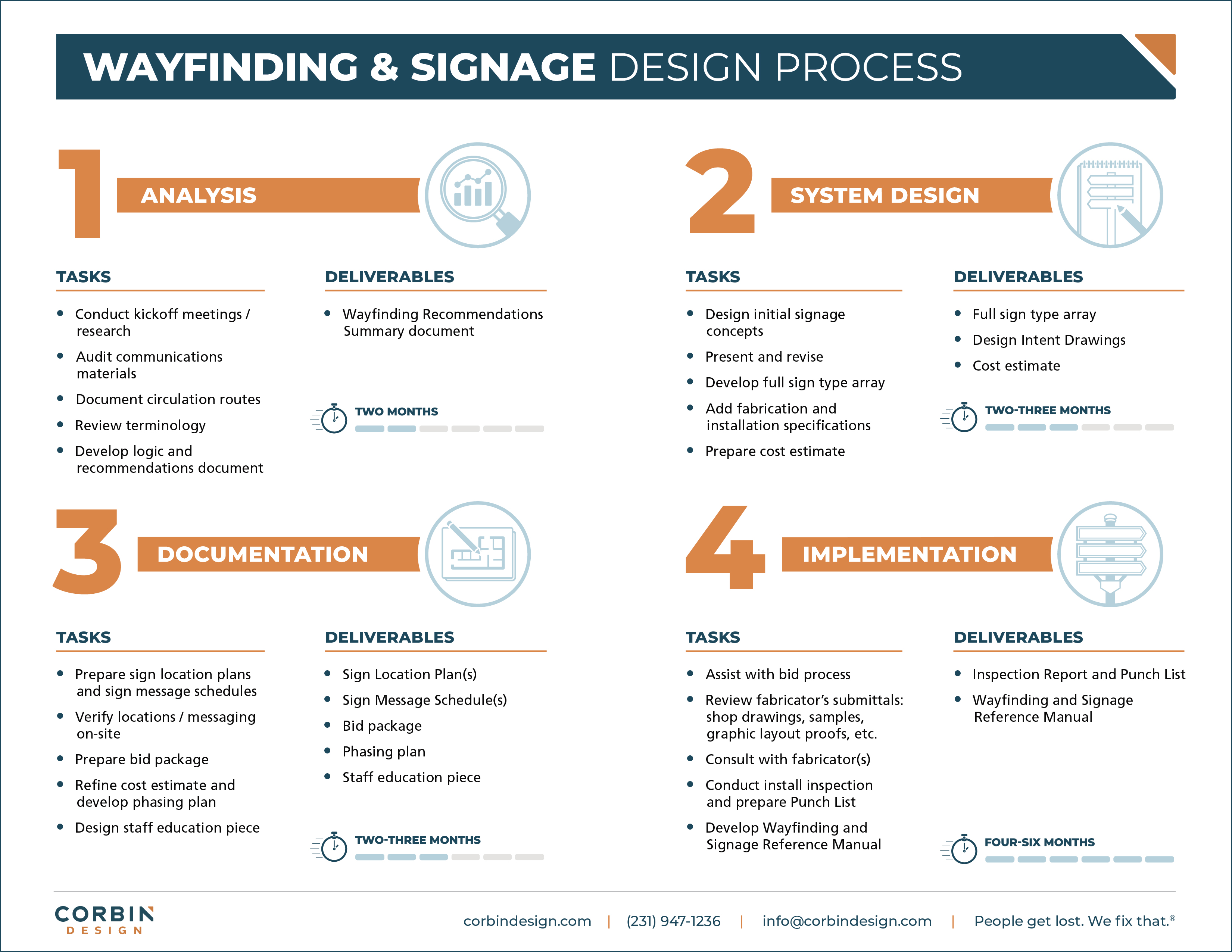 Corbin Design's comprehensive approach to wayfinding and signage projects has been successful for hundreds of projects throughout North America. Below is a graphic that briefly defines our four tasks of work, deliverables, and a preliminary timeline. During the proposal process, we work closely with our clients to customize the process to fit their project needs and budget.